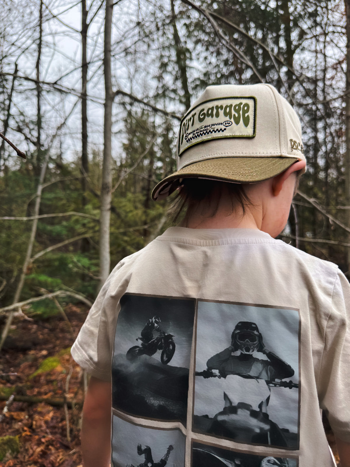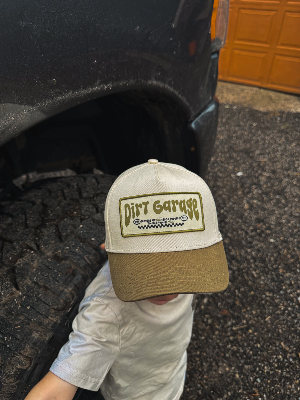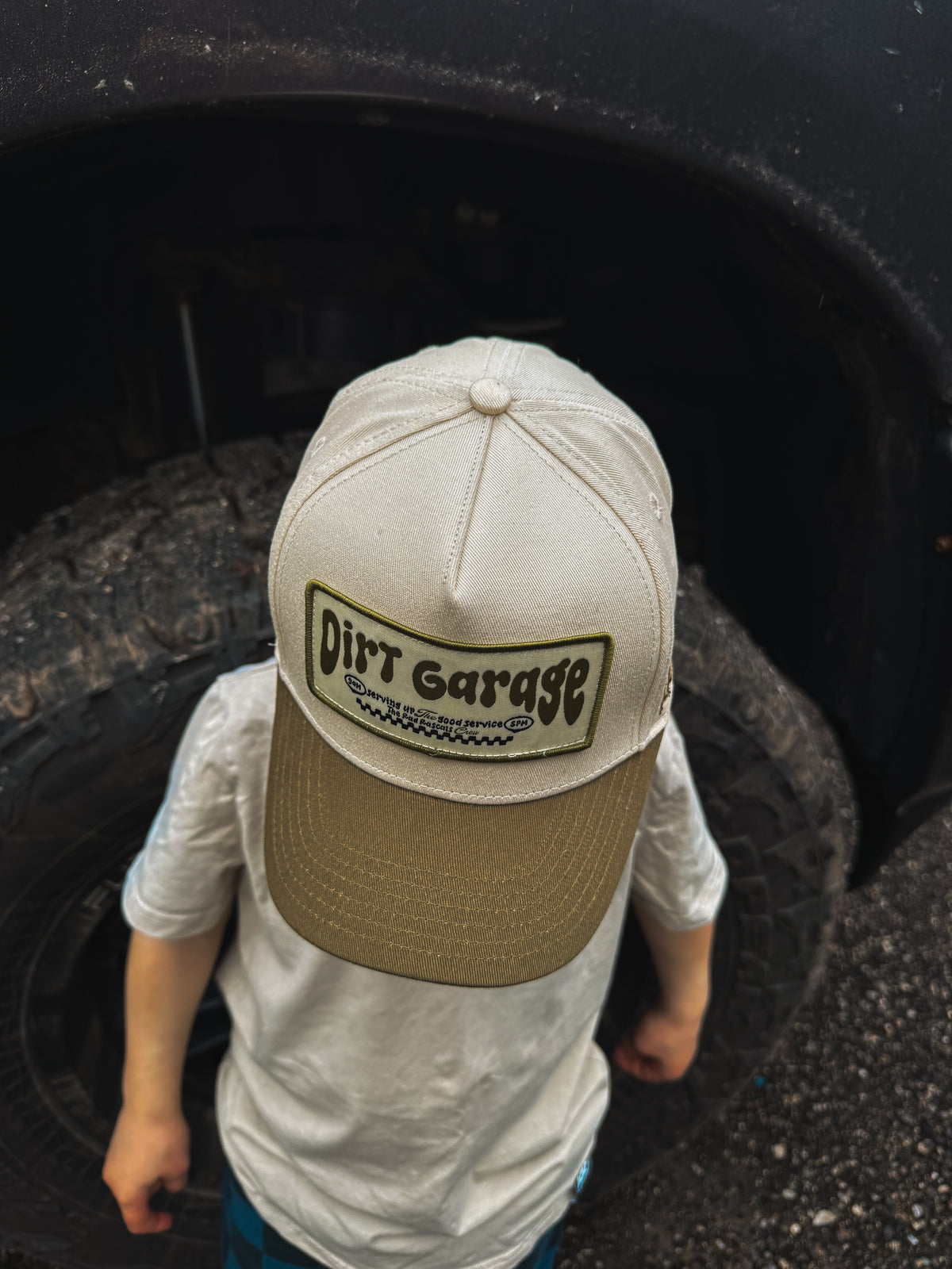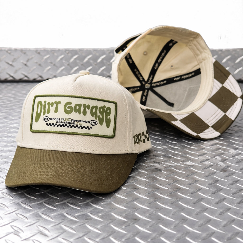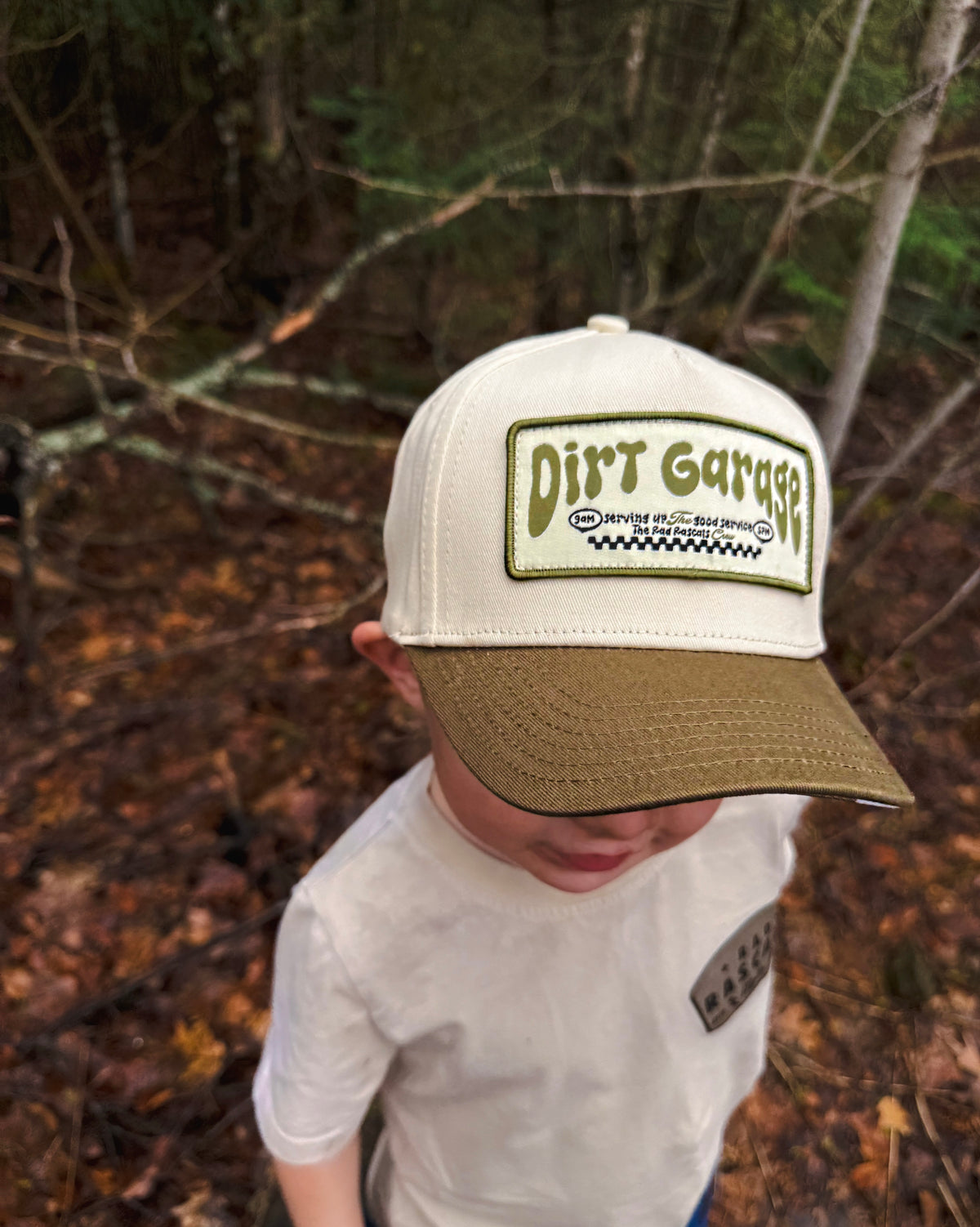 Inspired by our best-selling Dirt Garage tee and hoodie, this elevated snapback features clean all-cream paneling, a premium embroidered front patch, and a deep green bill for a subtle pop. Made from 100% cotton for a soft, breathable feel.
