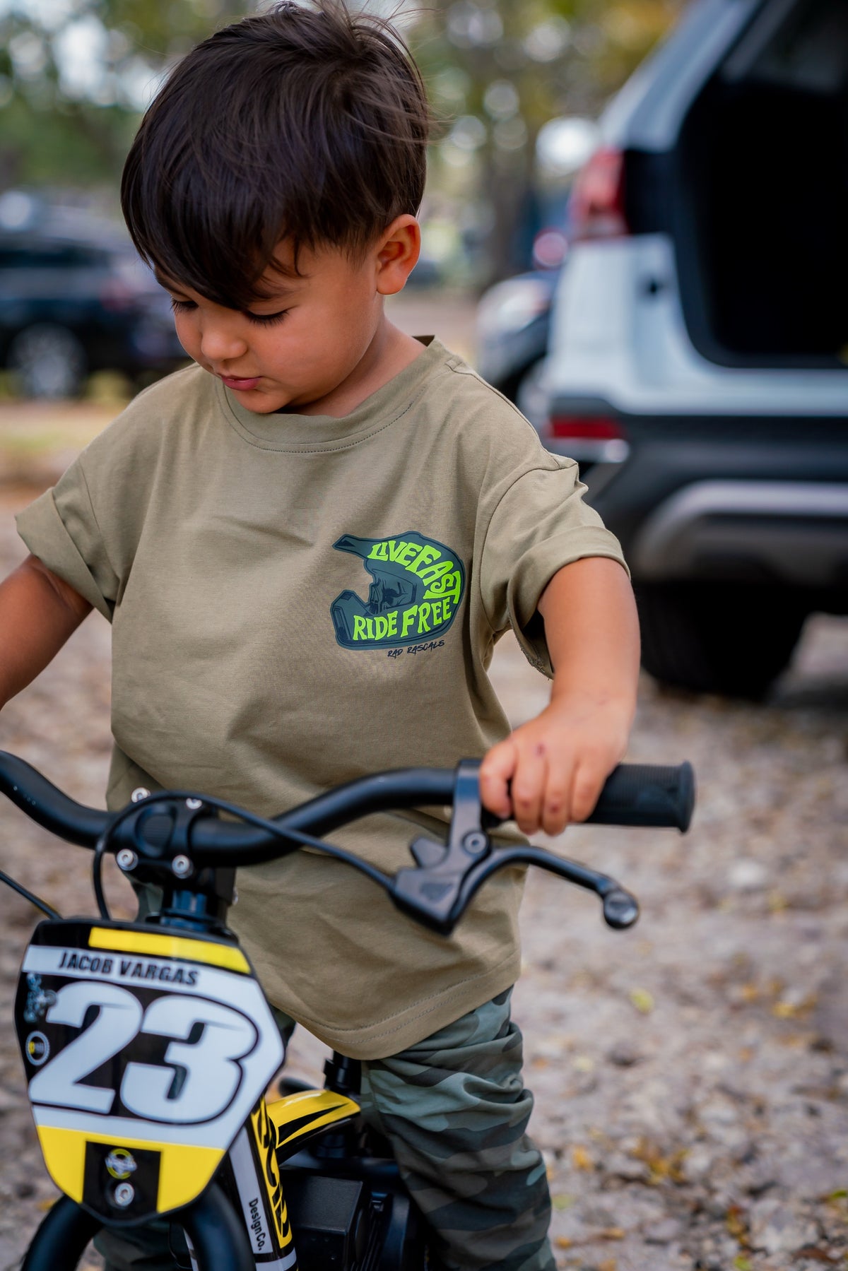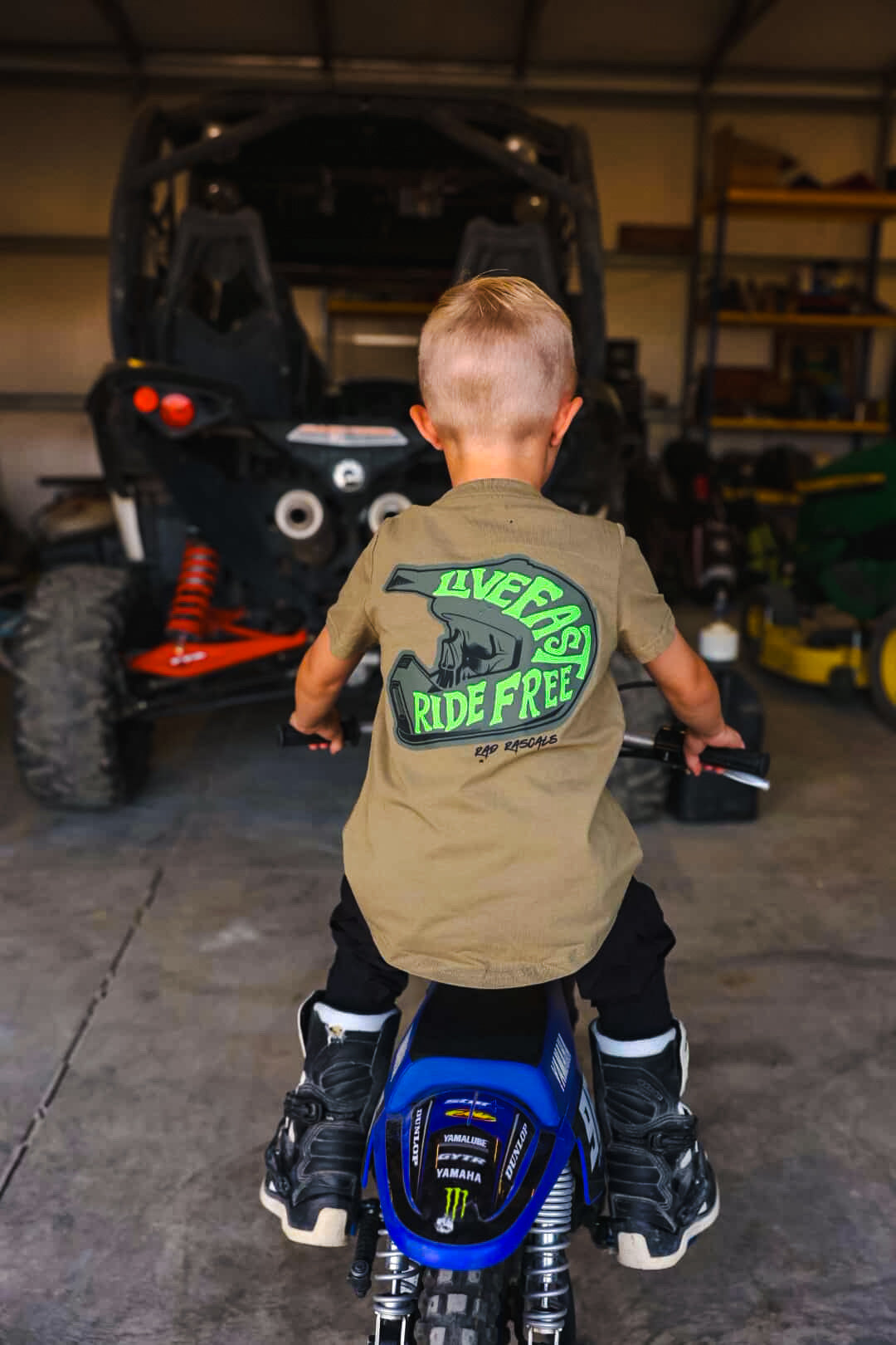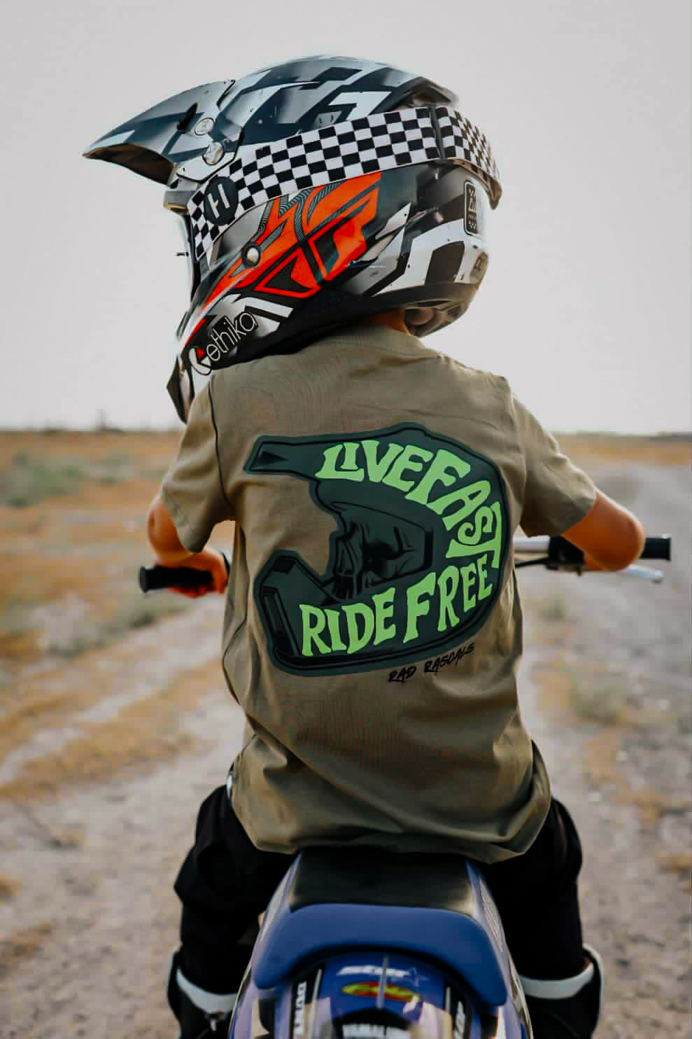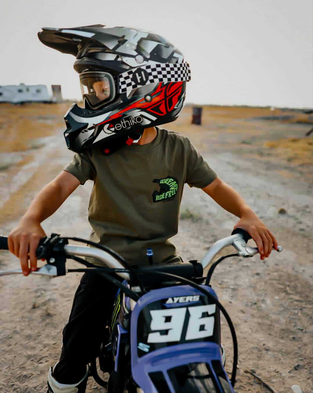 For the kid who dreams in dirt and lives for the ride — this tee is made to match their wild side. Featuring a bold motocross helmet graphic, a swing off of our best selling hoodie, it’s all about big energy, fast vibes, and fearless fun. Whether they’re tearing up the backyard or showing it off at races, this shirt brings track-ready style to every day.